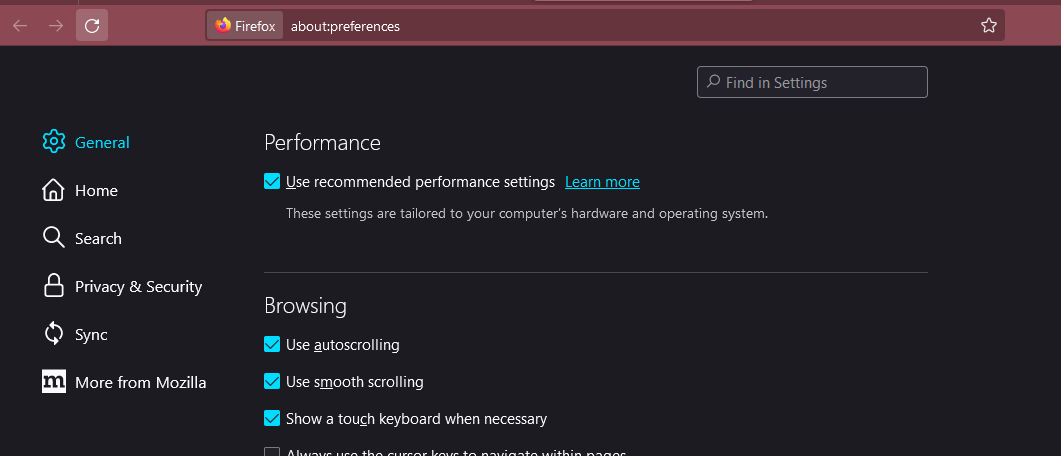 For Firefox, open Settings, scroll down to Performance in the General section. Uncheck the box for recommended settings and make sure Hardware Acceleration is checked. You can then re-check the performance box.