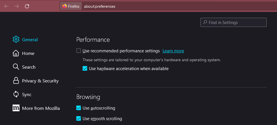 For Firefox, open Settings, scroll down to Performance in the General section. Uncheck the box for recommended settings and make sure Hardware Acceleration is checked. You can then re-check the performance box.